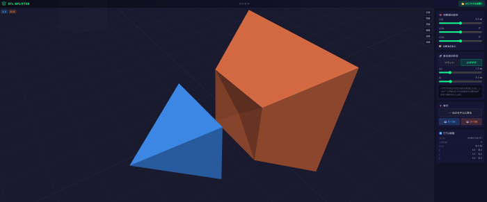 3Dプリンタのビルドプレートに収まらない大きなモデルを、接着しやすいジグザグ形状の切断面で分割するブラウザベースのツールです。